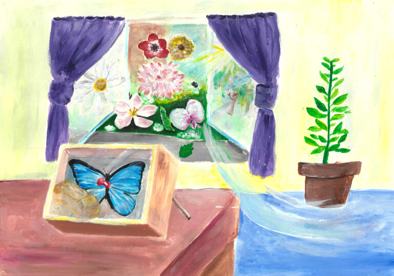 A butterfly was determined to select a very pretty bride among the flowers. However, he was rejected by Marguerite Daisy and had been unable to make a choice from season to season. Consequently, he remained single and became an old bachelor. Despite being pinned while admiring the flowers in the house, he still expressed his desire for freedom.
